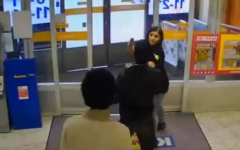 The employee quickly went for her can of pepper spray, dousing one of the thieves while his accomplice trailed behind him.