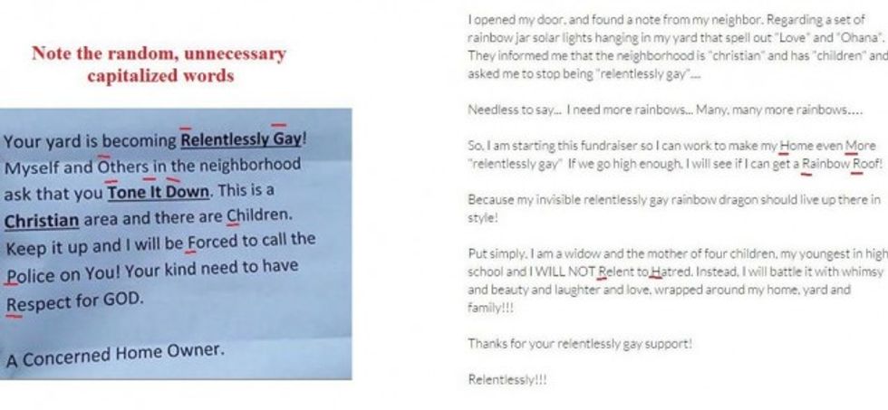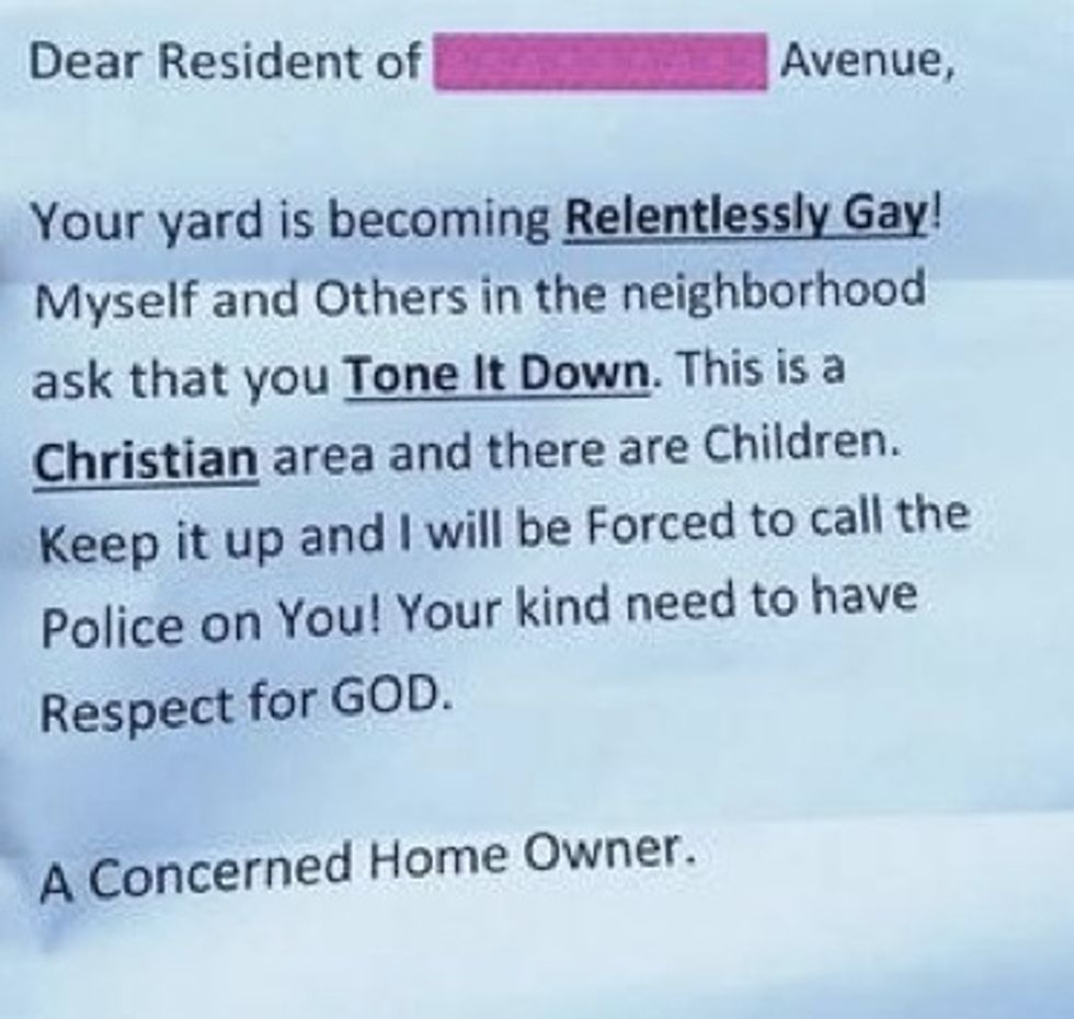 "Dear Resident of (address redacted) Avenue," the letter read. "Your yard is becoming Relentlessly Gay! Myself and Others in the neighborhood ask that you Tone It Down. This is a Christian area and there are Children. Keep it up and I will be Forced to call the Police on You! Your kind need to have respect for GOD. A Concerned Home Owner."