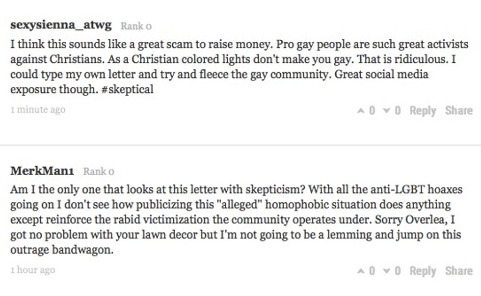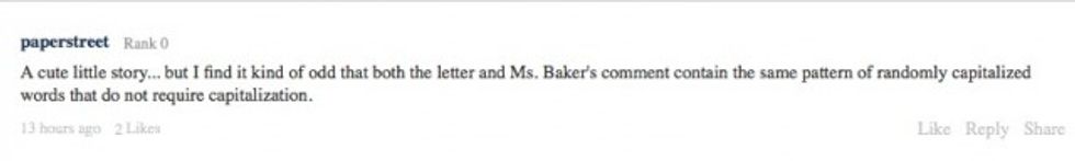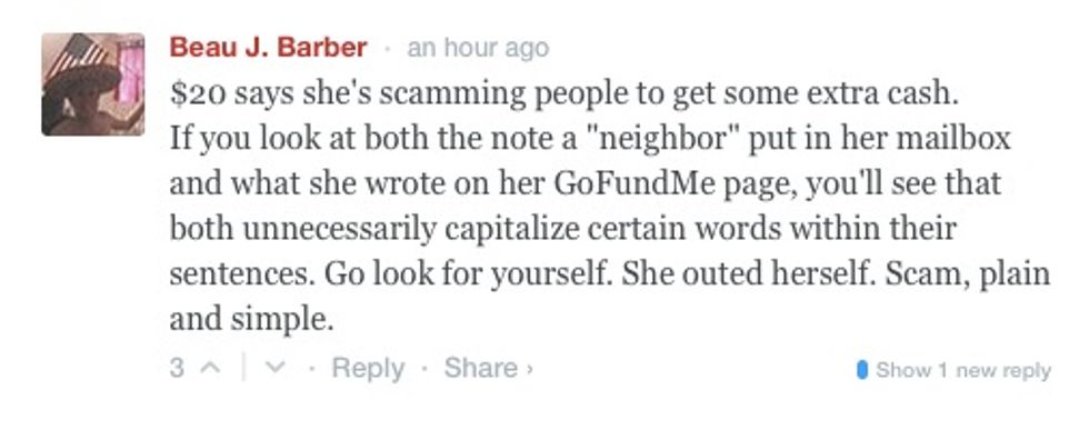 While the vast majority of reactions to Baker's story are supportive of her, others are saying the whole thing seems a bit off. More than a few have pointed to similar capitalization nuances in the letter Baker said was left in her door handle and in her GoFundMe note.