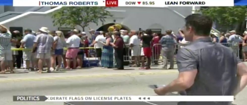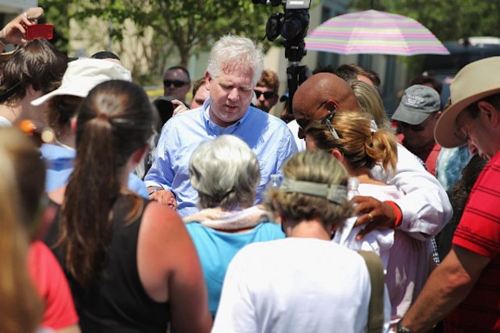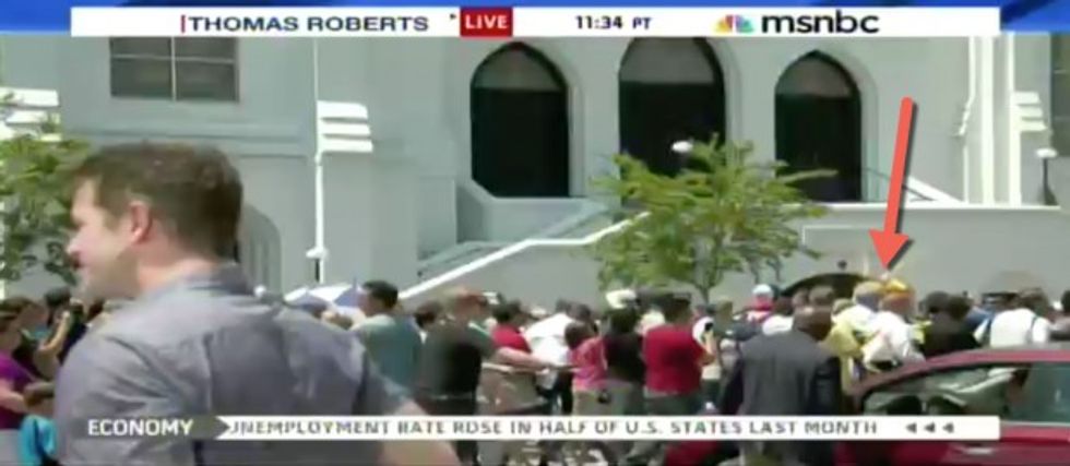As the bond was being set for accused killer Dylann Roof, Roberts described the scene of a mass of people showing up and singing. Unbeknownst to him, it seems, that crowd was at least in part the work of Glenn Beck, who flew down to pray in Charleston and invited people to meet him nearby. Beck can even be seen walking in the background of Roberts' TV shot at one point.