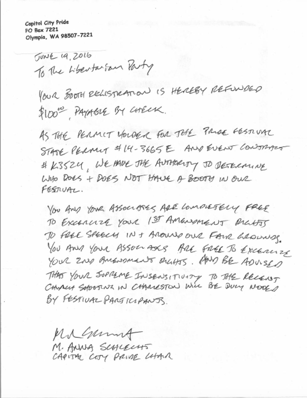 Aside from the check, Schlecht provided the LPWA members with a handwritten note that explained Capital City Pride's decision to take away their booth.
