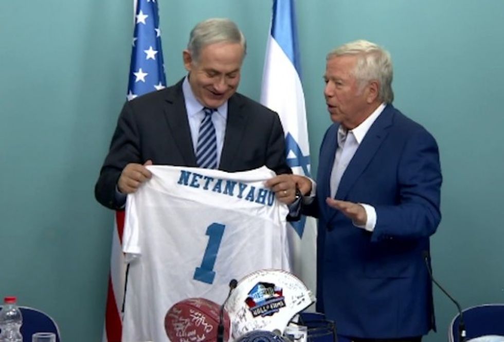 Israeli Prime Minister Benjamin Netanyahu receives a football jersey from New England Patriot’s owner Robert Kraft. (Image source: YouTube)\n