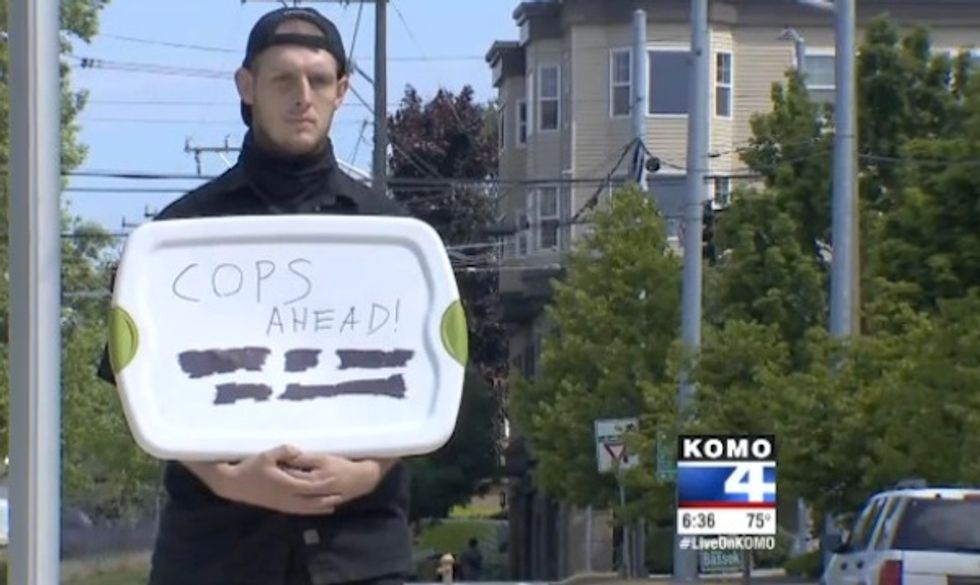 A Seattle man hoping to save others from tickets was fined himself for holding a sign along the side of the road, warning of "cops ahead."