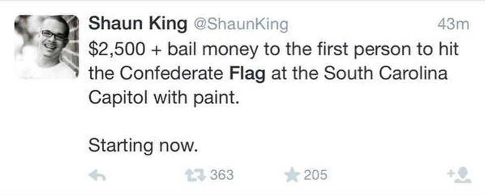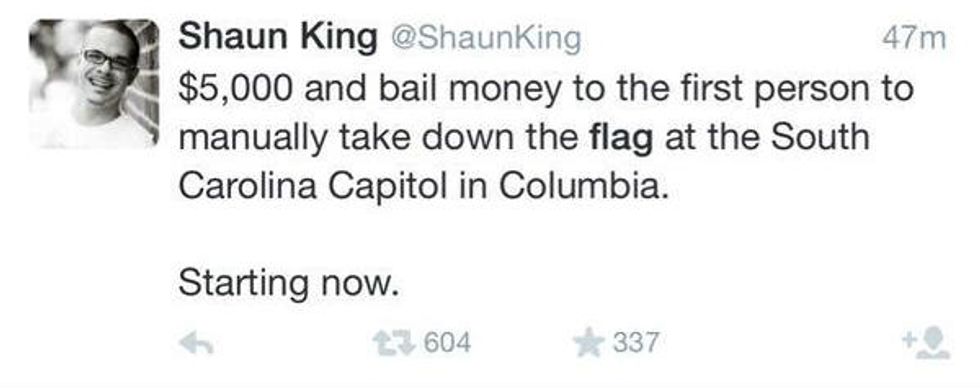 "$2,500 + bail money to the first person to hit the Confederate flag at the South Carolina Capitol with paint. Starting now," King tweeted.