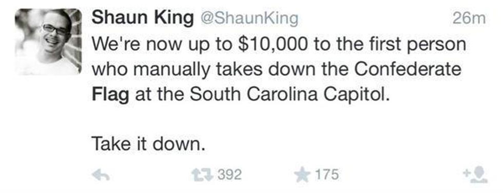 "We're now up to $10,000 to the first person who manually takes down the Confederate flag at the South Carolina Capitol," another tweet read.