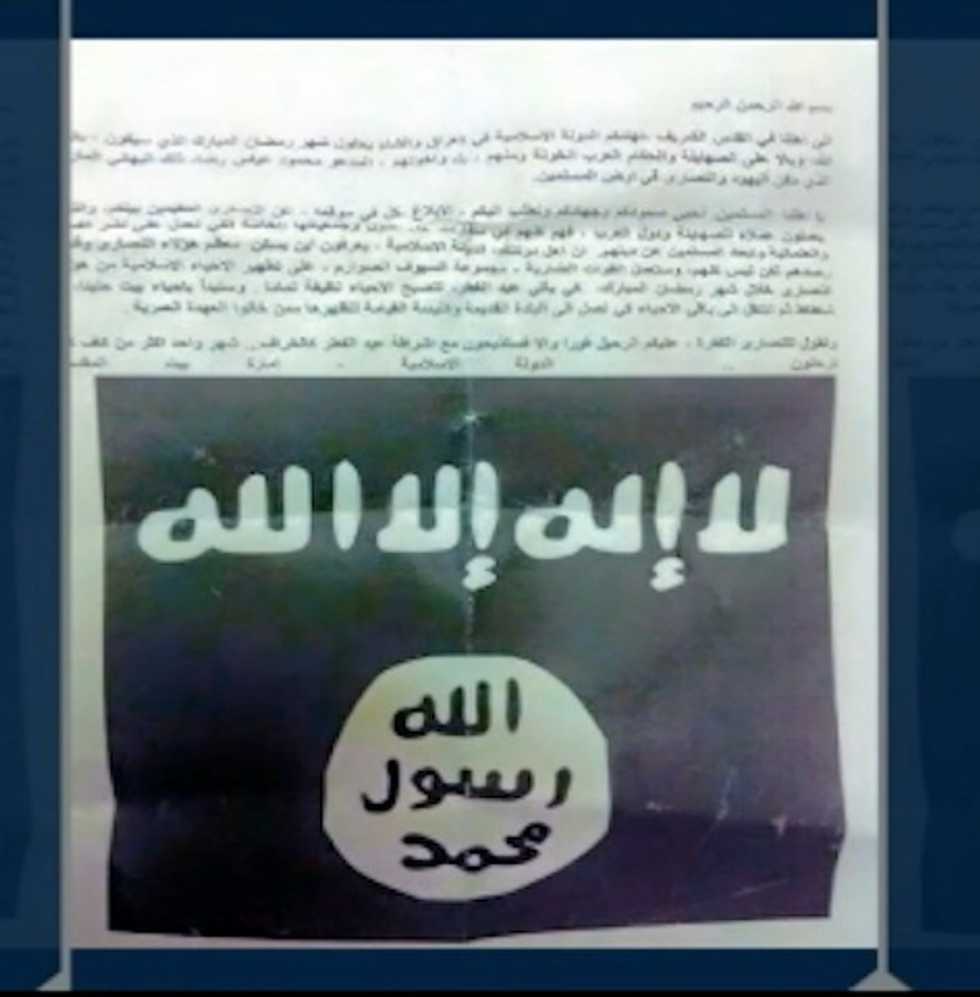 A flier signed by the "Islamic State in Palestine" threatened Christians who live in Jerusalem with "revenge." (Screenshot: Channel 10)