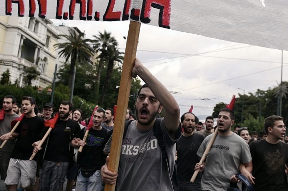 Greek protesters shout slogans as they march during a demonstration calling for an exit from the eurozone and a 'No' vote in the upcoming referendum in Athens on June 28, 2015. Greece weighed drastic banking restrictions to stave off a financial collapse as anxious Greeks emptied cash machines amid fears that banks will be closed this week. (Image source: LOUISA GOULIAMAKI/AFP/Getty Images)