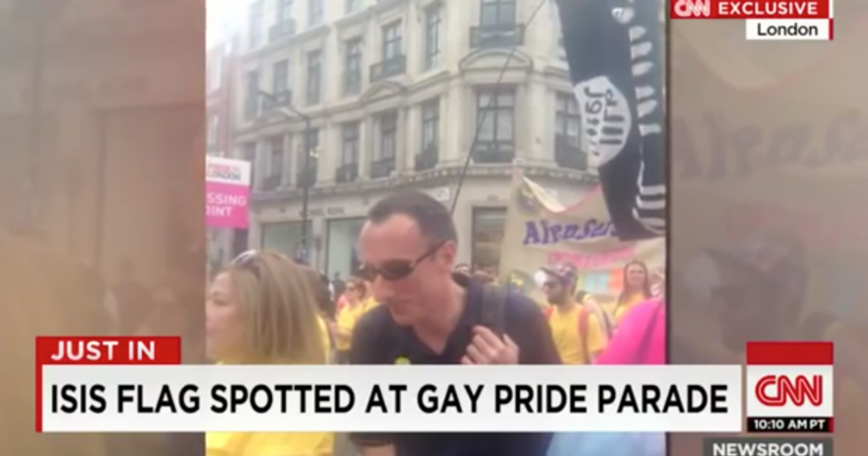 Against the onscreen banner, “ISIS flag spotted at gay pride event,” CNN journalist Lucy Pawle reported: “This man dressed in black and white was waving what appears to be a very bad mimicry, but a very clear attempt to mimic the ISIS flag, the black and white flag with the distinctive lettering.”