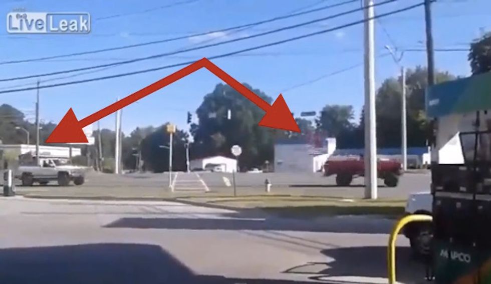One truck is seen rear-ending another as the unmistakable sound of one car bumper hitting another is heard. "Boom! Boom! I got that!" Exclaimed the man shooting the video. He later added, "God don't like ugly."