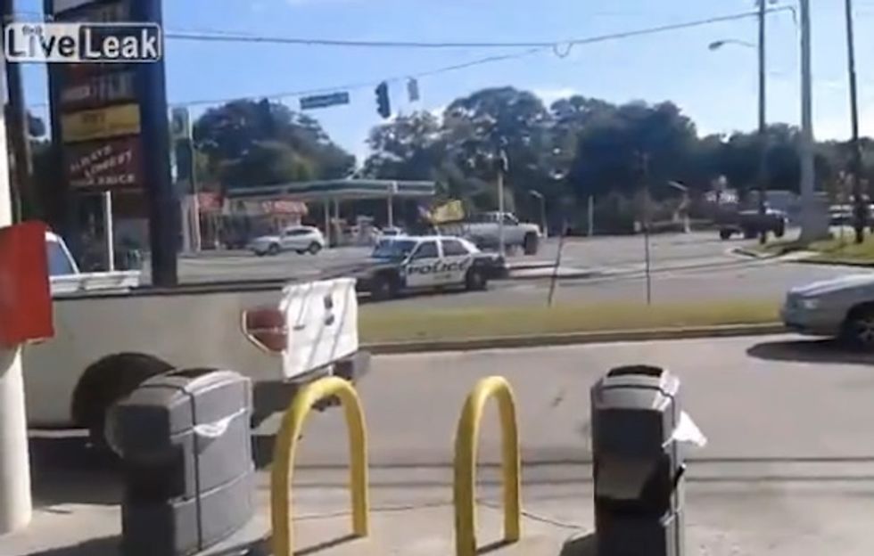 The trucks went by a gas station and were continuing through an intersection without stopping, thanks to the assistance from the local police who were blocking off the intersection. The man narrating the video commented, "They got the roads blocked off for these f***ing flags."