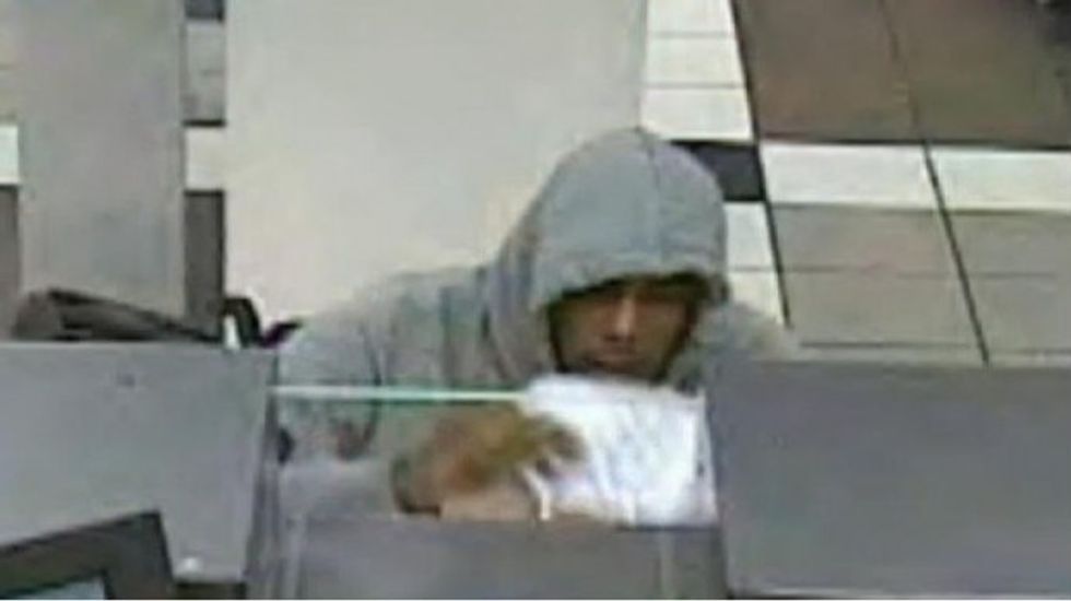Police say a man in his late 20s and wearing a grey hoodie wheeled into the bank and passed a note to the teller demanding cash. After receiving over $1,200 in bills, police say the suspect then fled westbound on Broadway in the wheelchair.