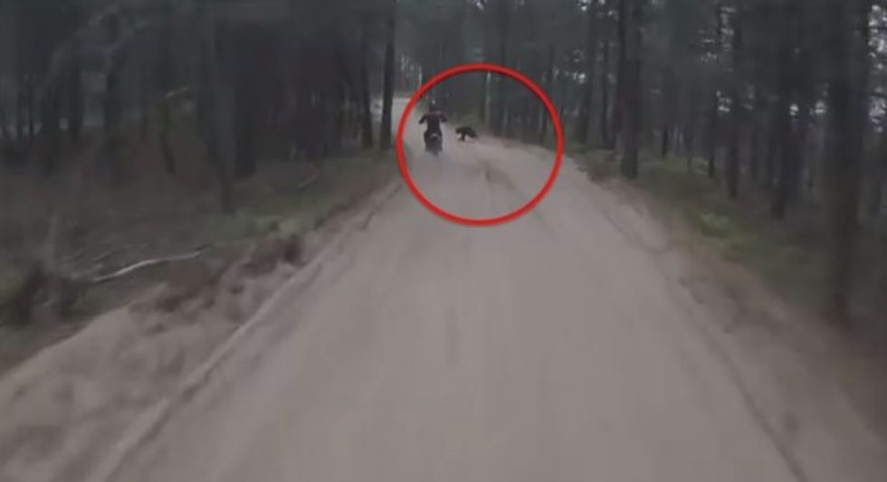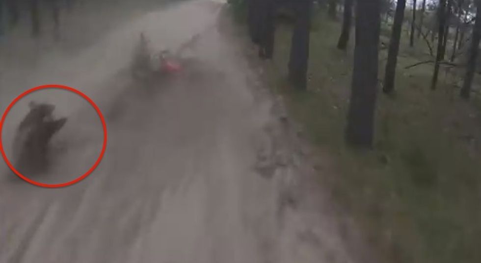 Andrew Finch, who wore a GoPro camera on his helmet at the time, captured the moment Chris Deweerdt collided with a young black bear crossing the trail in Baldwin, Michigan. Finch swerved and hit a tree to avoid them.