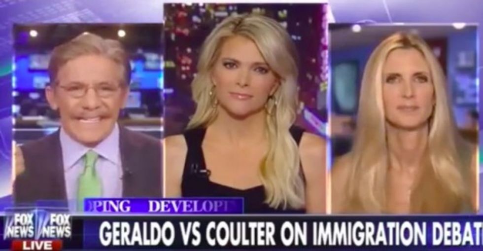 Ann Coulter and Geraldo Rivera clashed on Tuesday night over illegal immigration and Republican presidential candidate Donald Trump's controversial claim that Mexico is "sending people that have lots of problems" to America.