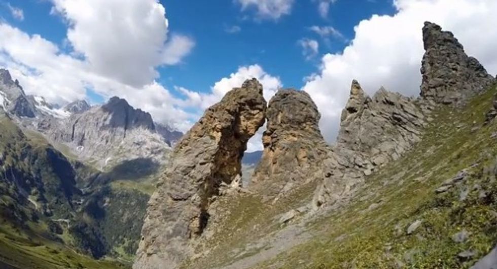 Measuring the hole in a mountain rock formation, Emanuele demonstrated how it was only about six feet wide, leaving very little room for error on his flight through it.