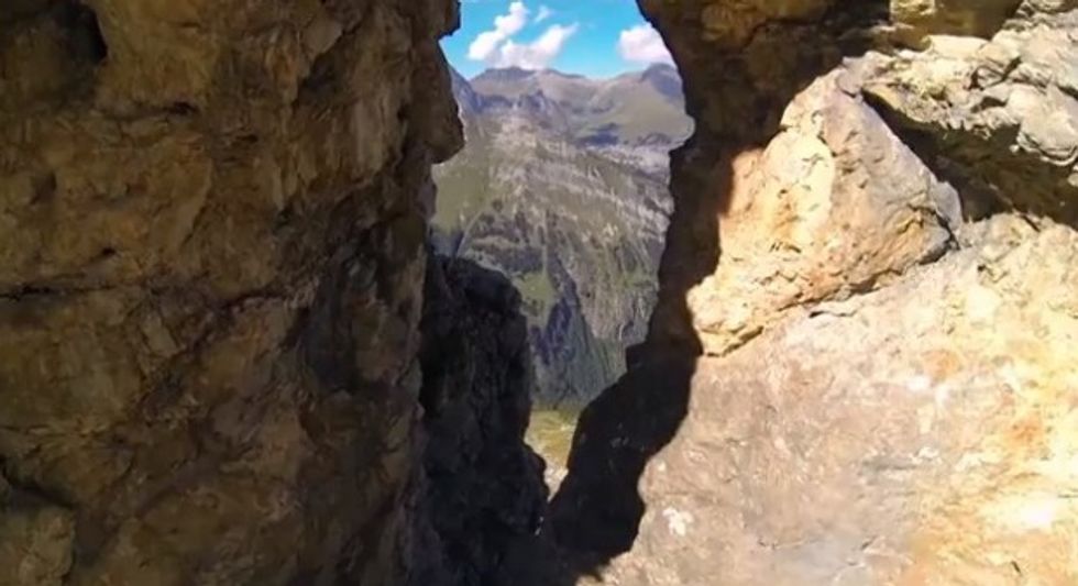 That's right, he planned to jump off a mountain and pilot his way through the relatively narrow hole.