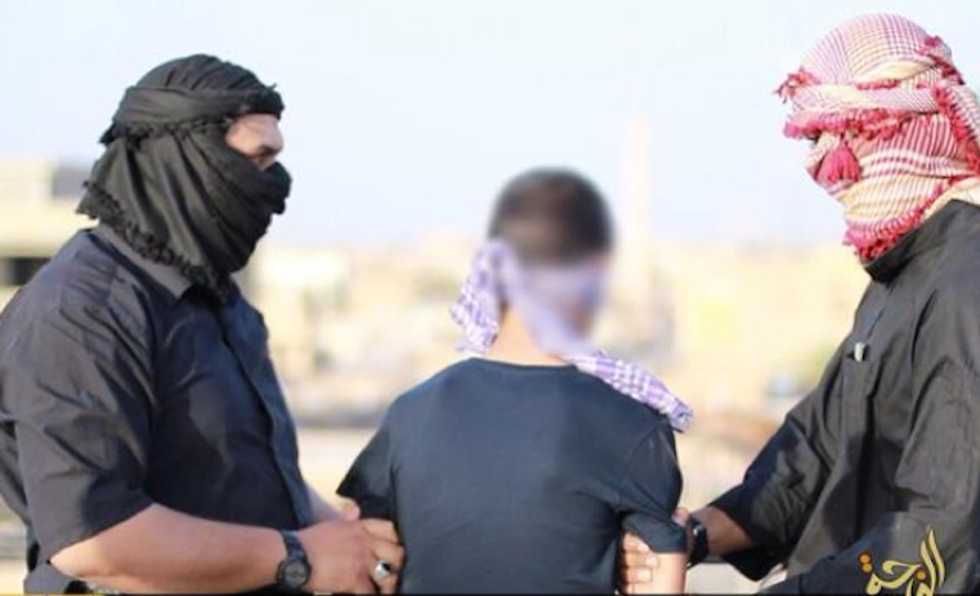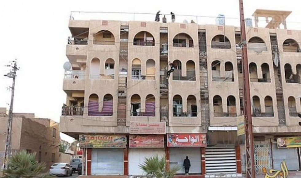 The images show the blindfolded men being led to the top of the building, then getting thrown head-first off of the structure.