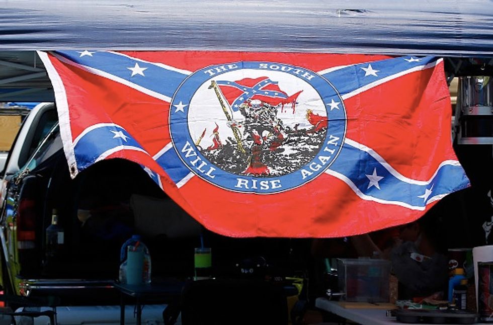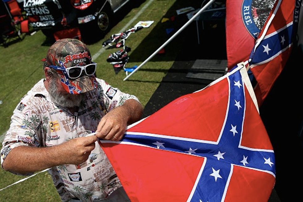 A fan holds a Confederate flag during practice for the NASCAR XFINITY Series Subway Firecracker 250 at Daytona International Speedway on July 3, 2015 in Daytona Beach, Florida. (Image source: Patrick Smith/Getty Images)