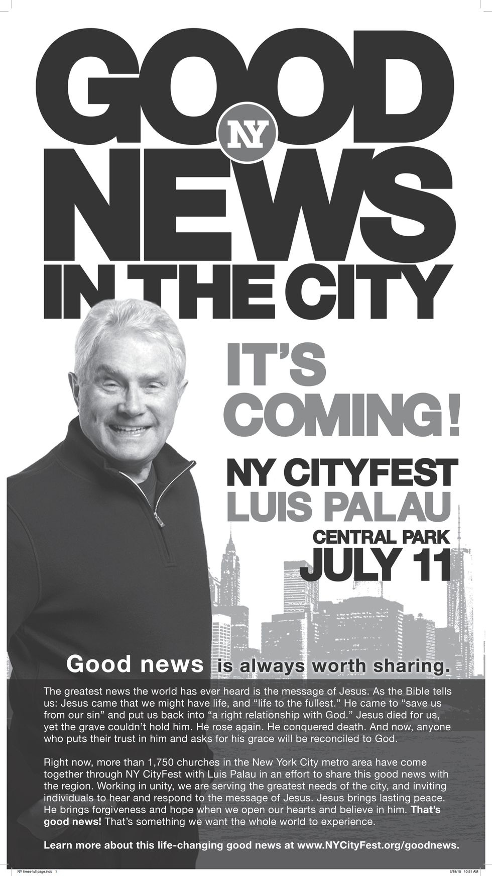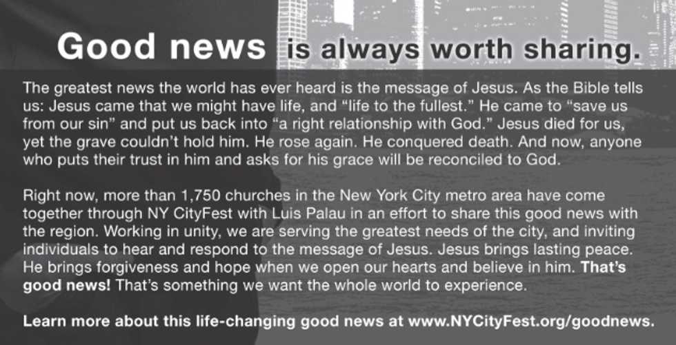 The ad also noted that more than 1,750 churches have come together to help make NY CityFest a reality. Find out more about the event, which will include famous Christian music acts and speakers and will take place on the Great Lawn in Central Park here.