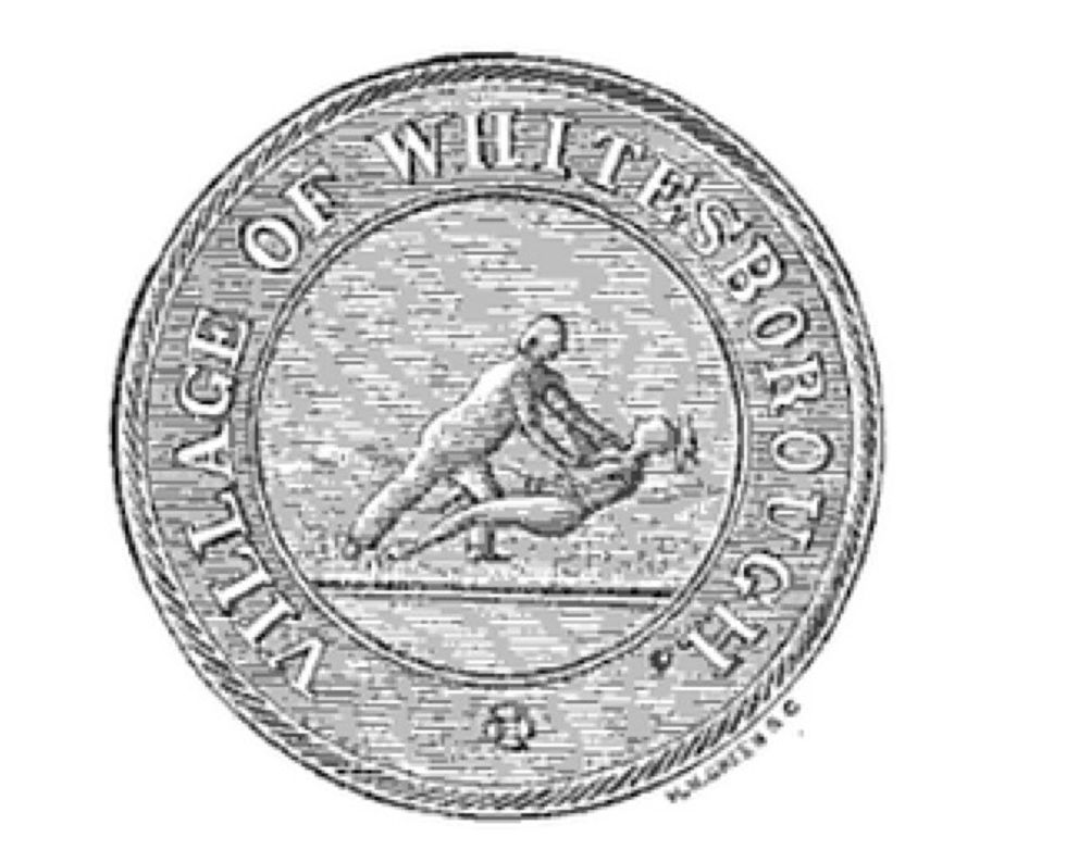 The seal depicts Hugh White — founder of the village about halfway between Syracuse and Albany — pushing down an American Indian in a field. Describing the origins of the artwork, the Whitesboro website calls it "a friendly wrestling match that helped foster good relations between White and the Indians."