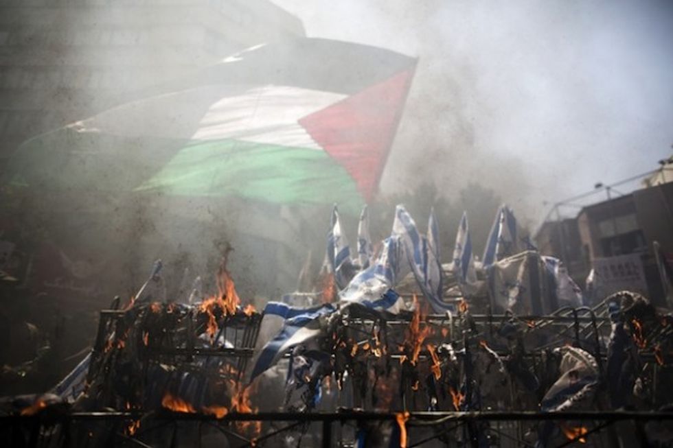 Iranian protestors wave a Palestinian flag over burning Israeli flags during a demonstration in Tehran on July 25, 2014 to mark the Quds (Jerusalem) Day. (Behrouz Mehri/AFP/Getty Images)