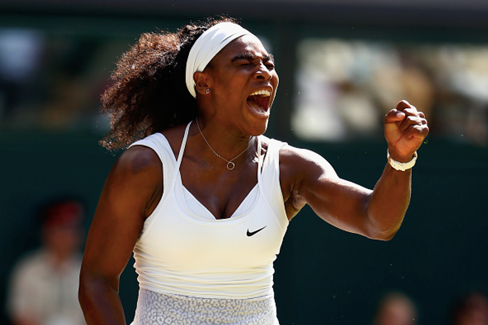 LONDON, ENGLAND - JULY 11: Serena Williams of the United States celebrates winning a point in the Final Of The Ladies' Singles against Garbine Muguruza of Spain during day twelve of the Wimbledon Lawn Tennis Championships at the All England Lawn Tennis and Croquet Club on July 11, 2015 in London, England. (Photo by Julian Finney/Getty Images)