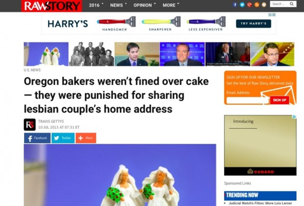 A Raw Story report published on Friday led with the headline, "Oregon bakers weren’t fined over cake — they were punished for sharing lesbian couple’s home address." But is that claim true true? The short answer: Absolutely not.