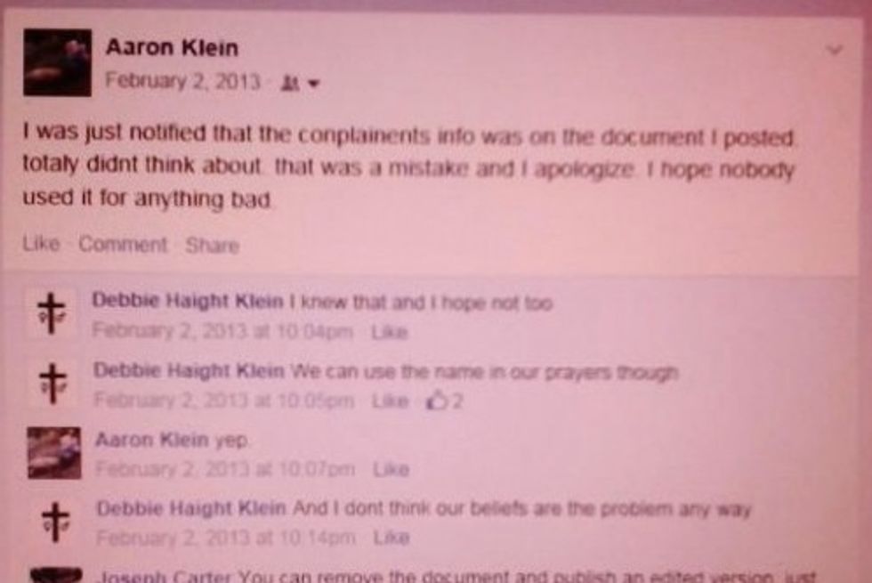 Klein said that he quickly apologized over the issue, and that the original posting of the complaint was removed just hours after he uploaded the document. He wrote a Facebook post on February 2, 2013 that read, "I was just notified that the [complainants'] info was on the document I posted. Totally didn't think about that, was a mistake and I apologize. I hope nobody used it for anything bad."