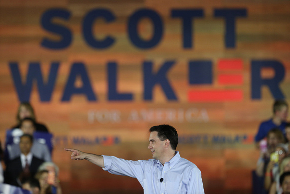 Scott Walker, governor of Wisconsin, takes the stage during his presidential campaign announcement in Waukesha, Wisconsin, U.S., on Monday, July 13, 2015. (Luke Sharrett/Bloomberg via Getty Images)