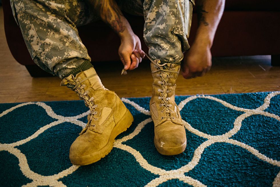 Army Sergeant Shane Ortega laces up boots before posing for a portrait at home at Wheeler Army Airfield on March 26, 2015 in Wahiawa, Hawaii. (Photo by Kent Nishimura/For The Washington Post via Getty Images)