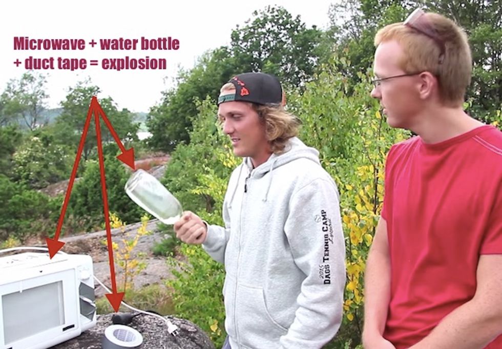 "This was the first time we tried with a water bottle," the younger Jönsson told us. "We have tried with 3-4 different things to blow up a microwave with but they did not work as good as simple water filled glass bottle did."