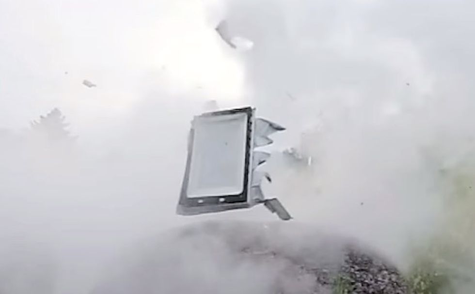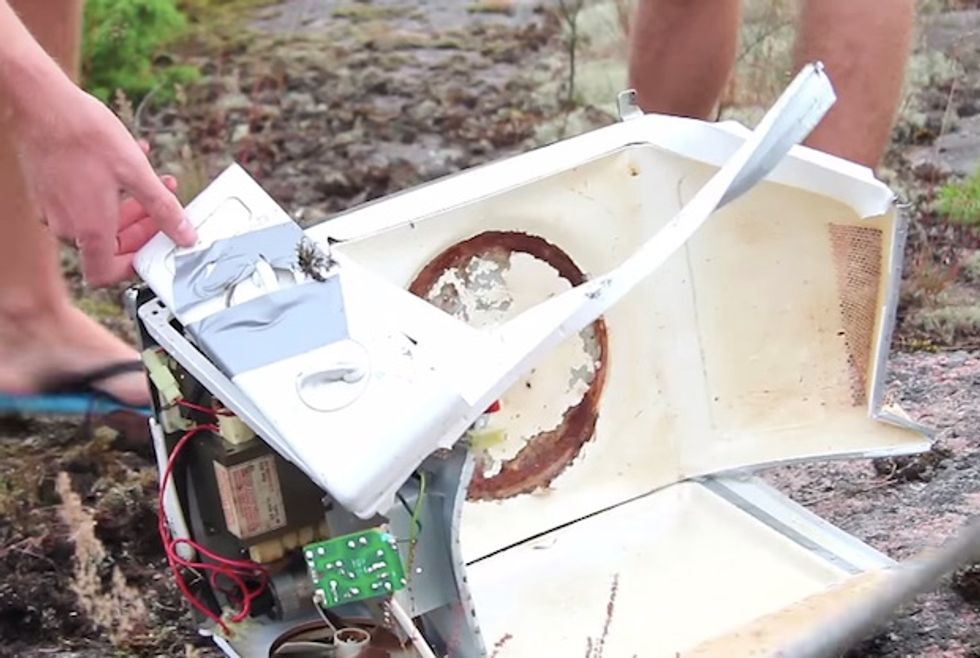 A camera placed near the doomed microwave oven captured the moment and showed the front door of the appliance sailing through the air.