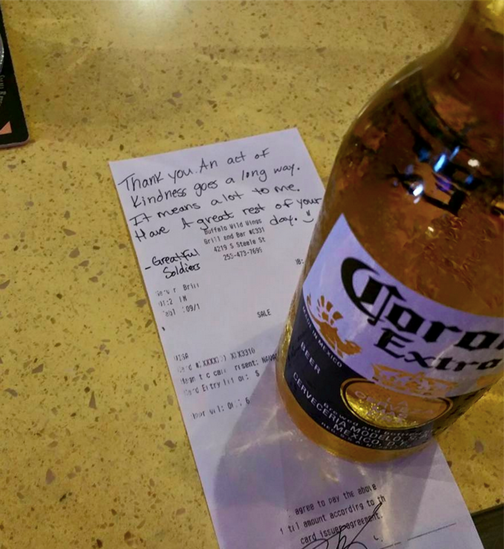 “Thank you. An act of kindness goes a long way. It means a lot to me. Have a great rest of your day," the woman, "a grateful soldier" wrote on the receipt before leaving the restaurant.