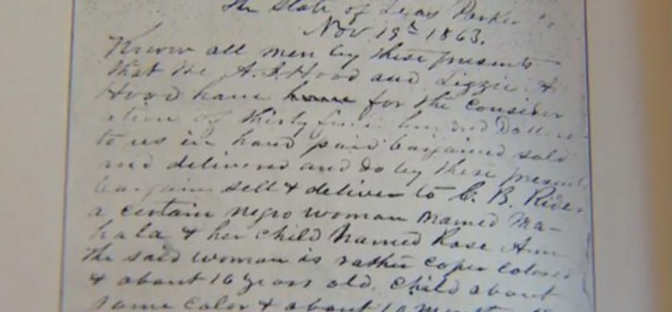 "Parker County, November 19, 1863," reads the bill of sale for his great great grandmother Mahala, and her infant daughter named Rose Ann. The 152-year-old text describes Mahala as just 16 years old, "light coffee colored" and lists her sale price at $3,500, WFAA-TV reported.