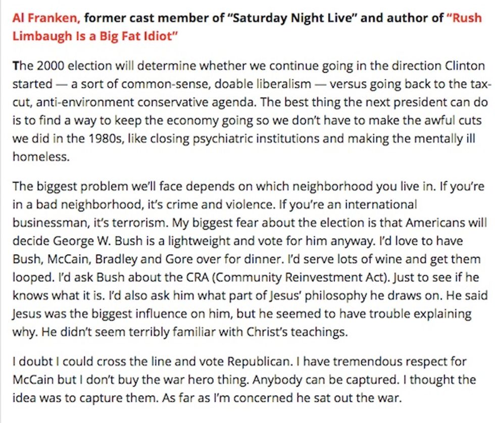 Franken's thoughts were part of a post on Salon.com in January of 2000 in a story titled, "What's at Stake in the 2000 Elections?"