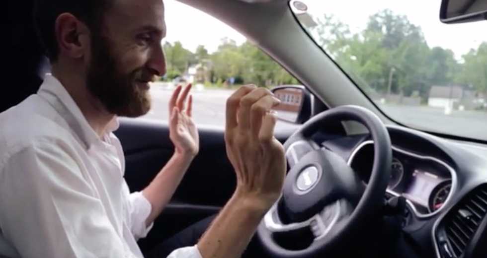 Greenberg lets go of the wheel of the Jeep Cherokee as security researchers take control, demonstrating how they've been able to exploit a vulnerability in the car's Internet-connected entertainment system to hack other elements. (Image source: Wired video)