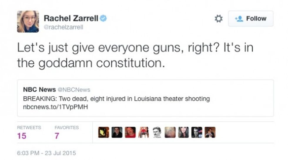 A BuzzFeed News editor called for individuals to "push for gun control" as news of a deadly shooting at a Lafayette, Louisiana, movie theater unfolded Thursday night.