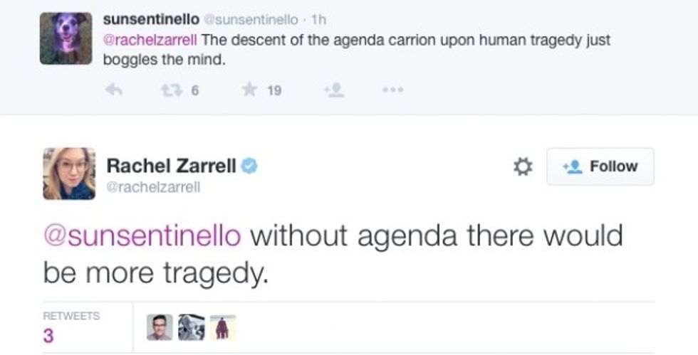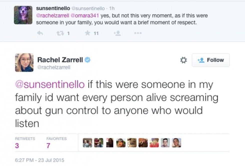 When an individual suggested that Zarrell first give the victims and their families "a brief moment of respect," she responded.