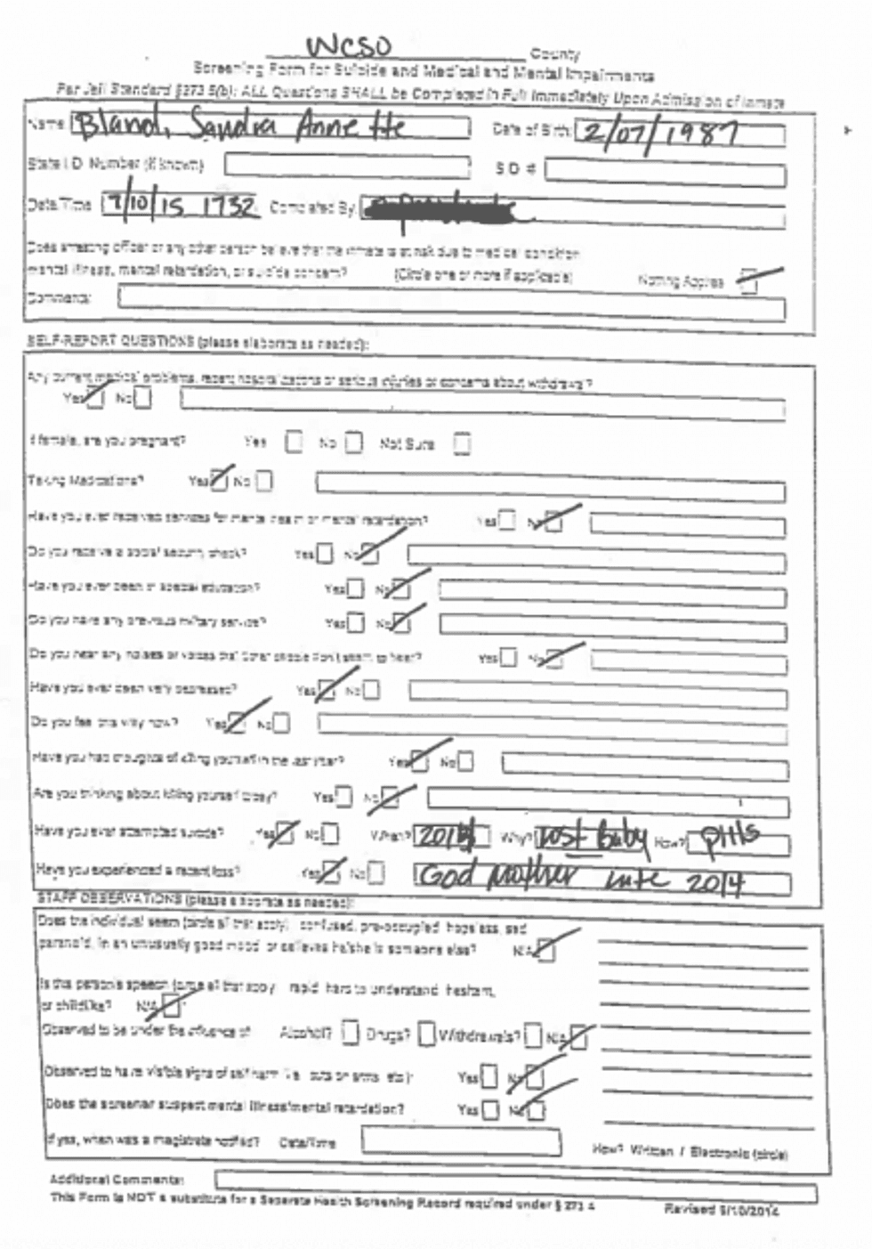 One questionnaire says Bland took pills in 2015 in an attempt to kill herself after losing a baby. A separate form filled out by another jail employee says the suicide attempt occurred in 2014.