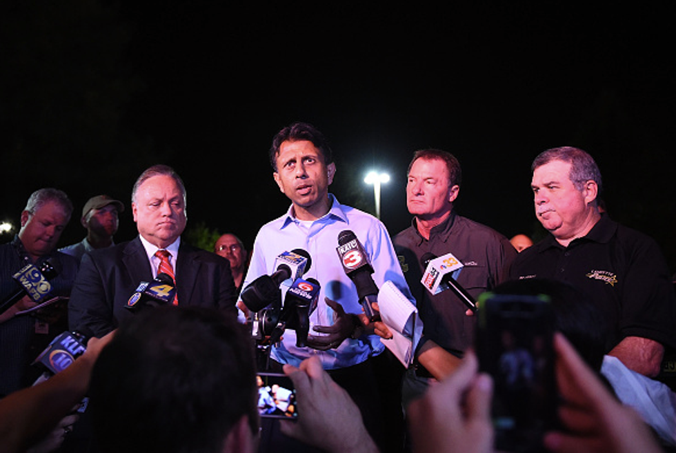 Governor Bobby Jindal speaks to the media in front of Johnston Street Java near the Grand Theatre on July 23, 2015 in Lafayette, Louisiana. (Photo by Stacy Revere/Getty Images)