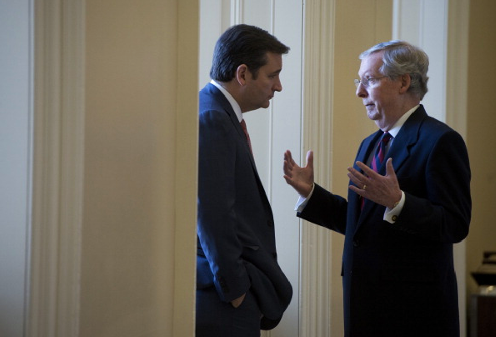 Senate Minority Leader Mitch McConnell, R-Ky., right, talks with Sen.-elect Ted Cruz, R-Texas, outside of a senate republican lunch in the Capitol. (Photo By Tom Williams/CQ Roll Call)