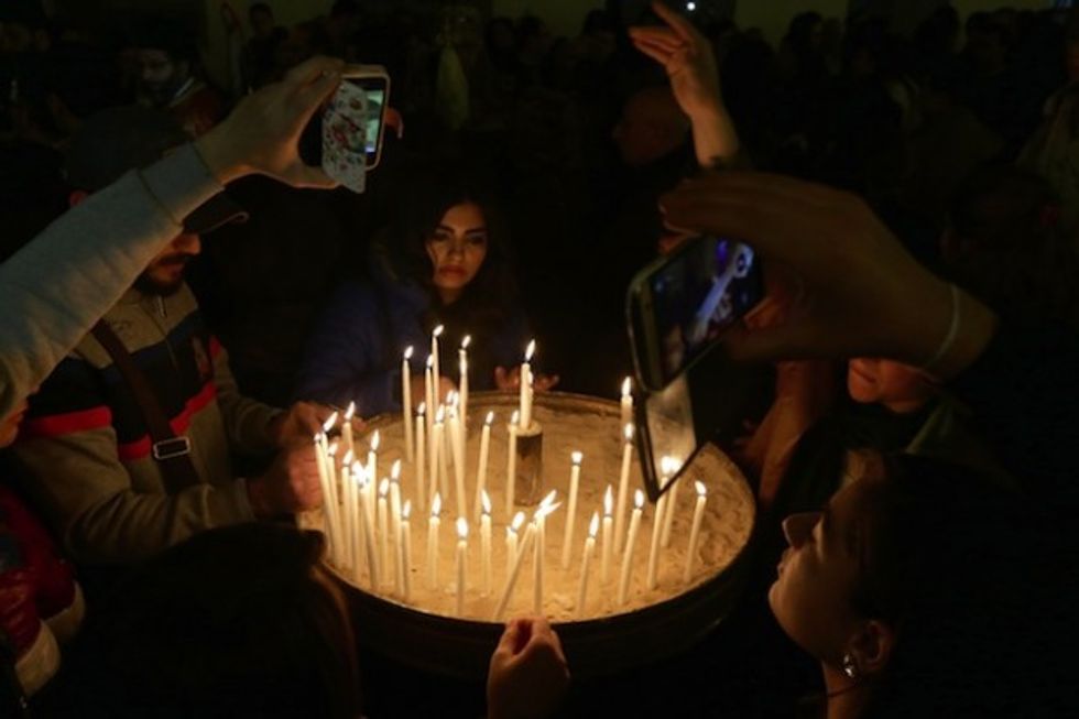 Greek Orthodox Christians light candles and take pictures at the end of a Good Friday mass at the Meriamiah Church in the Syrian capital Damascus on April 10, 2015. (Louai Beshara/AFP/Getty Images)