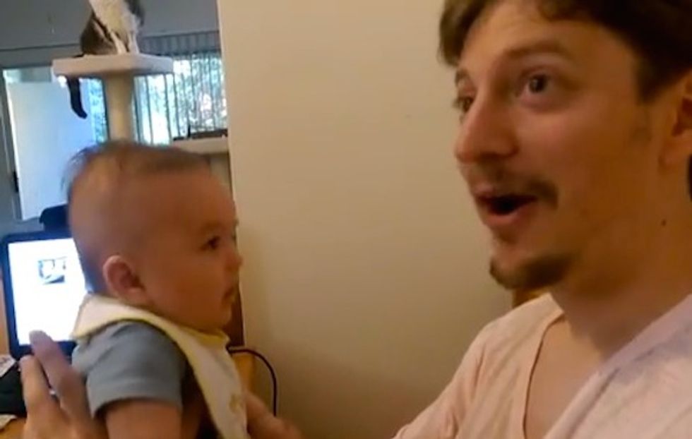 X's face when his infant son seems to repeat "I love you" back to him. (Image source: YouTube)