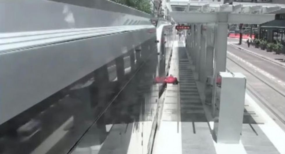 The footage shows a man at a light rail stop standing next to the train just as it's getting read to take off from the station. But one of the man's legs then becomes stuck between the train and the platform, nearly swallowing up the entire lower half of his body.