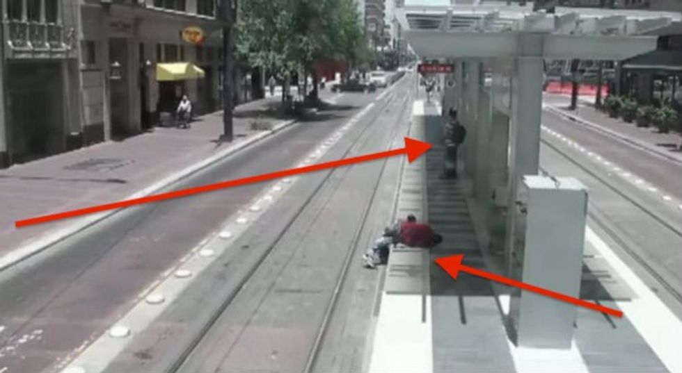 The rest of the video shows the man at the stop paying no attention to the victim or his probable injuries, even looking in the opposite direction at one point.