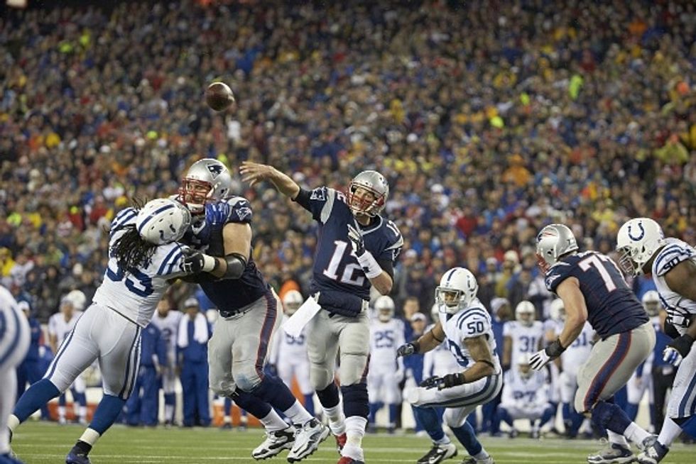 New England Patriots QB Tom Brady (12) passing against the Indianapolis Colts during the AFC Championship Game at Gillette Stadium in Foxborough, Massachusetts, Jan. 18, 2015. (Image source: Winslow Townson/Sports Illustrated/Getty Images)
