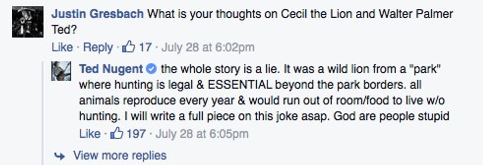 Ted Nugent turned to his Facebook page this week to share his passionate thoughts on the lion killed by an American dentist, lashing out at "stupid" individuals who have strongly criticized the hunter.