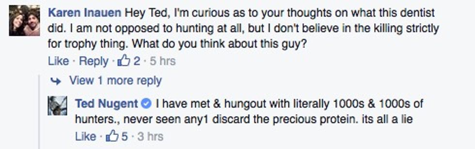 Responding to another commenter, Nugent said the idea the hunt was a "trophy" kill was "a lie."