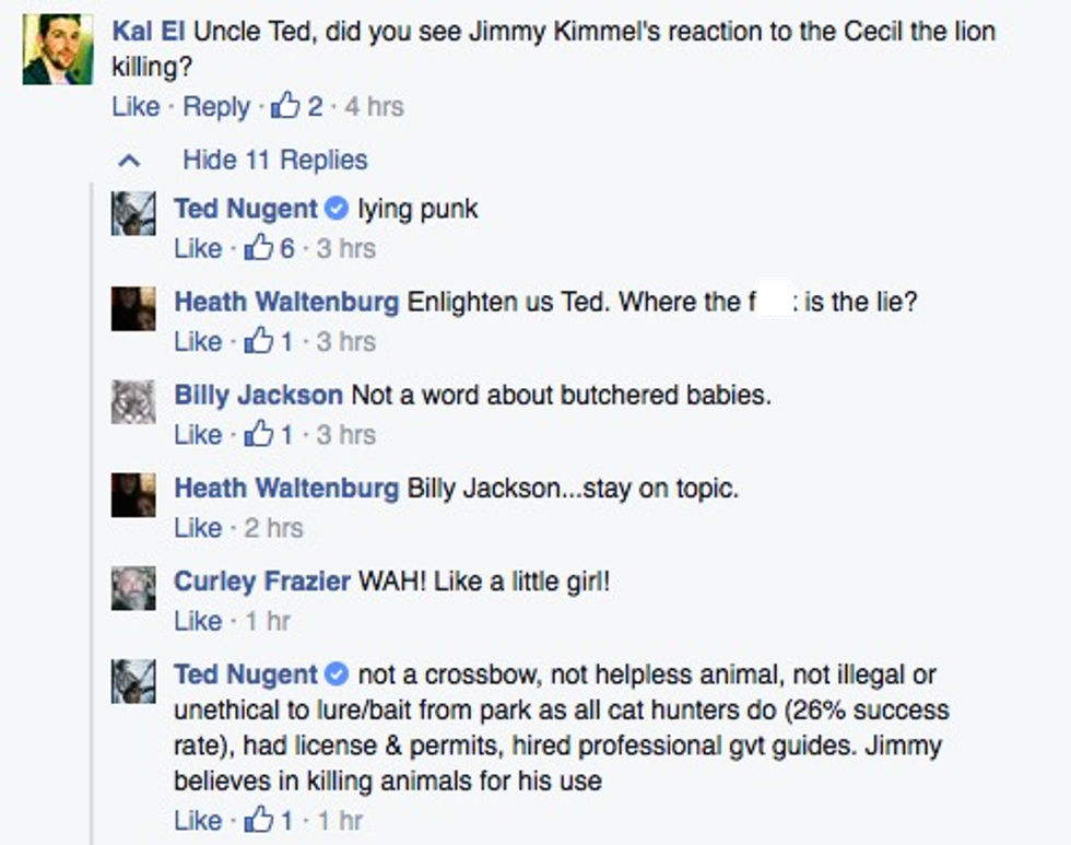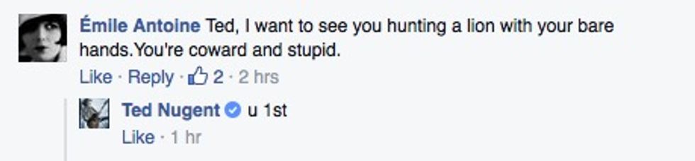 When one person called Nugent a "coward and stupid," saying she'd like to see him hunt a lion with his "bare hands," the rocker simply replied, "u 1st."