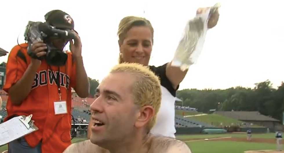 Before the game, several brave souls received a free back waxing, seated atop the Baysox dugout and in full view of the public: