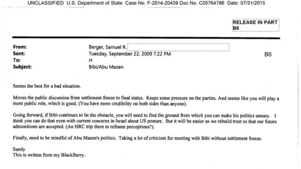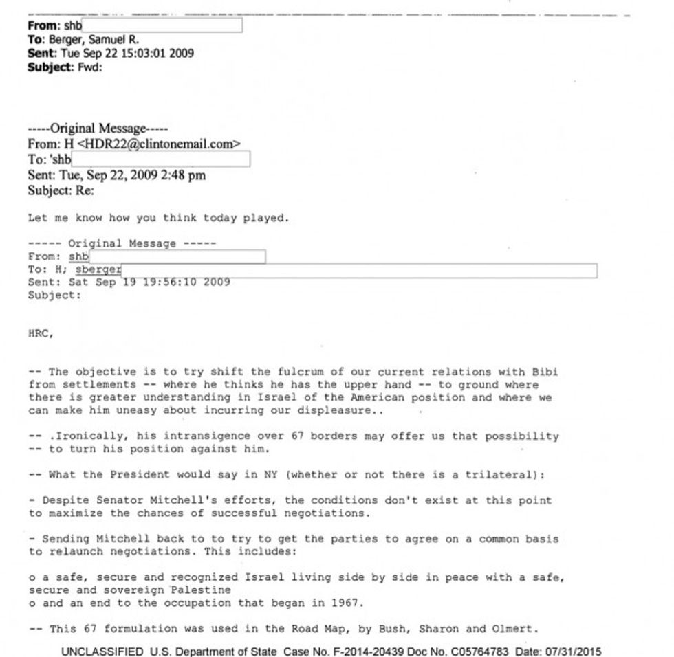 "Going forward, if Bibi continues to be the obstacle, you will need to find the ground from which you can make his politics uneasy," the September 22 email said. "I think you can do that even with current concerns in Israel about US posture."